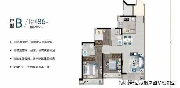 86㎡三房:空间布局合理,居住舒适度更高。
