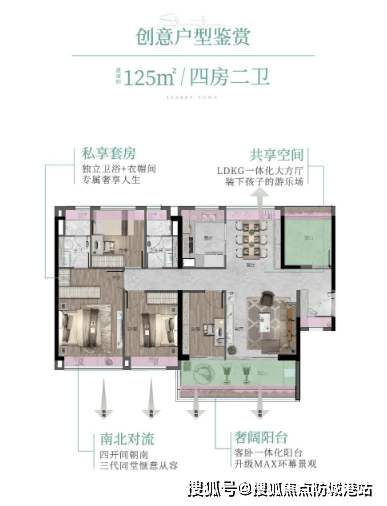 125㎡五房两厅两卫:客餐厅南北对流,双面宽观景阳台,实用率超高。