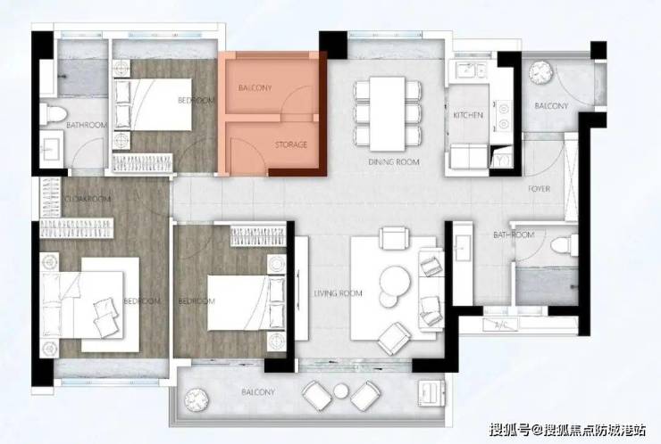 主卧套房:带独立卫浴,超大阳台(约6.8米)连接客厅与次卧,通风效率提升30%。