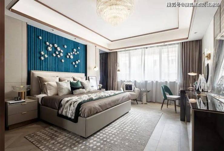 主人房整体空间以蓝色为主题,以木质、皮革、丝棉、金属质感来打造新中式的高端品质、搭配着淡淡的色彩,让整个空间弥漫着低调的奢华,及神秘的优雅,每一件家具都成为最独韵臻贵的艺术品。