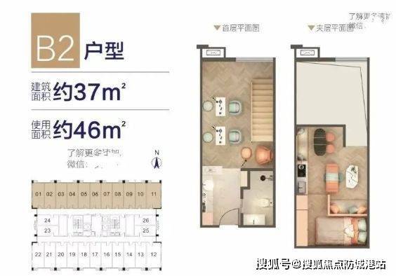 公寓 B 户型同样为复式结构,在空间利用上独具匠心。一层的客厅区域宽敞,可放置舒适的沙发与茶几,打造温馨的休闲空间。餐厅紧邻厨房,方便用餐。卫生间位于一层,使用便捷。二层设置卧室与卫生间,双卫生间设计提升居住便利性。卧室空间可根据需求进行布置,满足个性化需求。整体户型动静分区明确,休息区与活动区互不干扰。