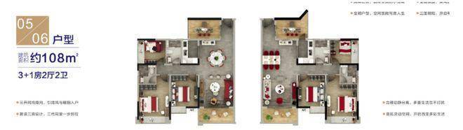 正南朝向使整个户型阳光充足,冬暖夏凉。108㎡的空间较为宽敞,3 + 1 房设计灵活性高,多出的一房可作为书房、衣帽间或客房使用,满足家庭多样化需求。客厅宽敞明亮,与餐厅、阳台一线贯通,视觉上更加开阔。主卧套房不仅面积较大,还可配备独立的衣帽间和卫生间,提升居住品质。另外两个次卧也能提供舒适的居住空间。双卫生间设计方便家庭成员使用,避免拥挤。厨房空间宽敞,操作流程顺畅,可满足多人同时烹饪。