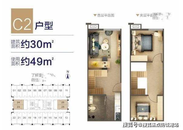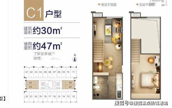 公寓 C 户型在 29 - 47㎡的空间内,实现了功能的最大化。复式设计让空间层次感丰富,一层为开放式的活动空间,可根据个人喜好灵活布置,如打造为工作室、小型健身房等。二层为卧室与卫生间,私密舒适。户型通过合理的收纳设计,如嵌入式衣柜、壁柜等,提高空间利用率。适合自由职业者或对空间有独特需求的人群。