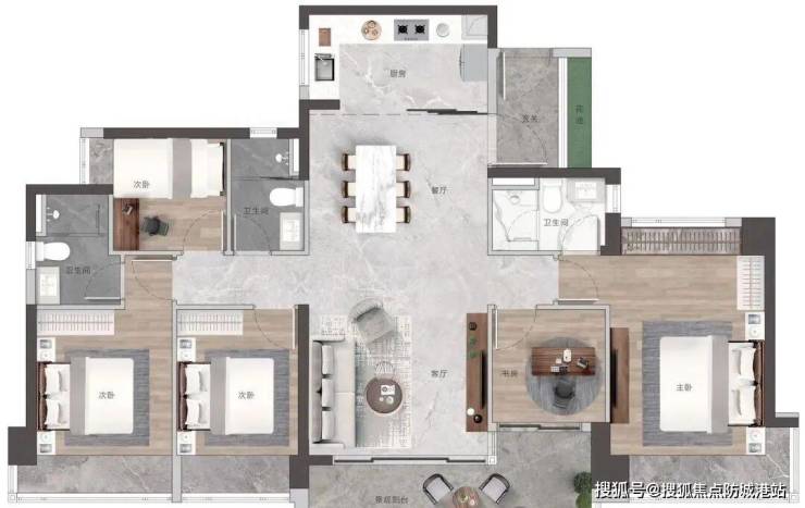 182㎡四房两厅三卫:层高3.3米,净开间阔绰宽厅连通景观阳台,使用率接近100%。