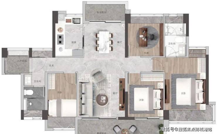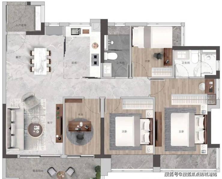 113㎡四房两厅两卫:同样拥有3.15米优越层高,净长约5.4米双面宽阳台,达96%超高使用率。