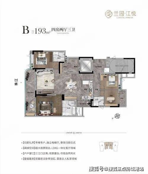 卷立面的设计让兰园江悦成为了城市的封面地标之一。项目特别注重建筑外观与周围环境的和谐统一,采用现代简约风格,结合大面积玻璃幕墙,使得整座建筑既具有现代感又不失温馨。产品面积从约193㎡到285㎡不等,每户几乎都能实现270°看江,尤其是285平户型还配备了独特的弧形转角阳台,最大限度地放大了江景视野,为住户带来前所未有的视觉享受。