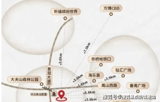 项目位于番禺大夫山南门旁(番禺气象局侧),生态优势突出:西北侧直线约 600 米即达9000 亩大夫山森林公园,2 公里内还有滴水岩森林公园(7290 亩)、莲湖湿地公园(366 亩),日常散步、休闲触手可及。交通以自驾为主:门前禺山西路连接番禺大道、东新高速、新光快线,10 分钟达市桥商圈,20 分钟到万博 CBD,30 分钟直达珠江新城;公共交通方面,距地铁 3 号线市桥站约 5 公里(可公交接驳),未来规划地铁 26 号线将进一步完善交通网络。