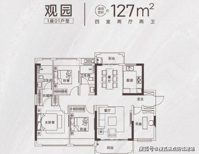 127㎡户型采用正统的南北双阳台设计,且四开间朝南,户型方正。南北双阳台保证了空气的对流与充足的采光,四开间朝南使得每个房间都能充分享受阳光的眷顾,极大提升了居住舒适度。客厅宽敞大气,连接观景阳台,可作为家庭聚会与休闲娱乐的主要场所。餐厅与厨房紧密相连,方便用餐。主卧套房设计,配备独立卫生间,提升居住私密性。次卧和书房布局合理,可满足家庭成员不同的居住与生活需求,无论是二孩家庭还是三代同堂,都能在这个空间里找到舒适的生活方式。