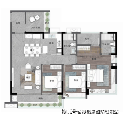 约89㎡ 3+1房2厅2卫:四开间九面采光,全明通透户型,LDKG一体化客餐厨设计,客厅&次卧空间随心组合,约5.6米双面宽阳台,独立主套。