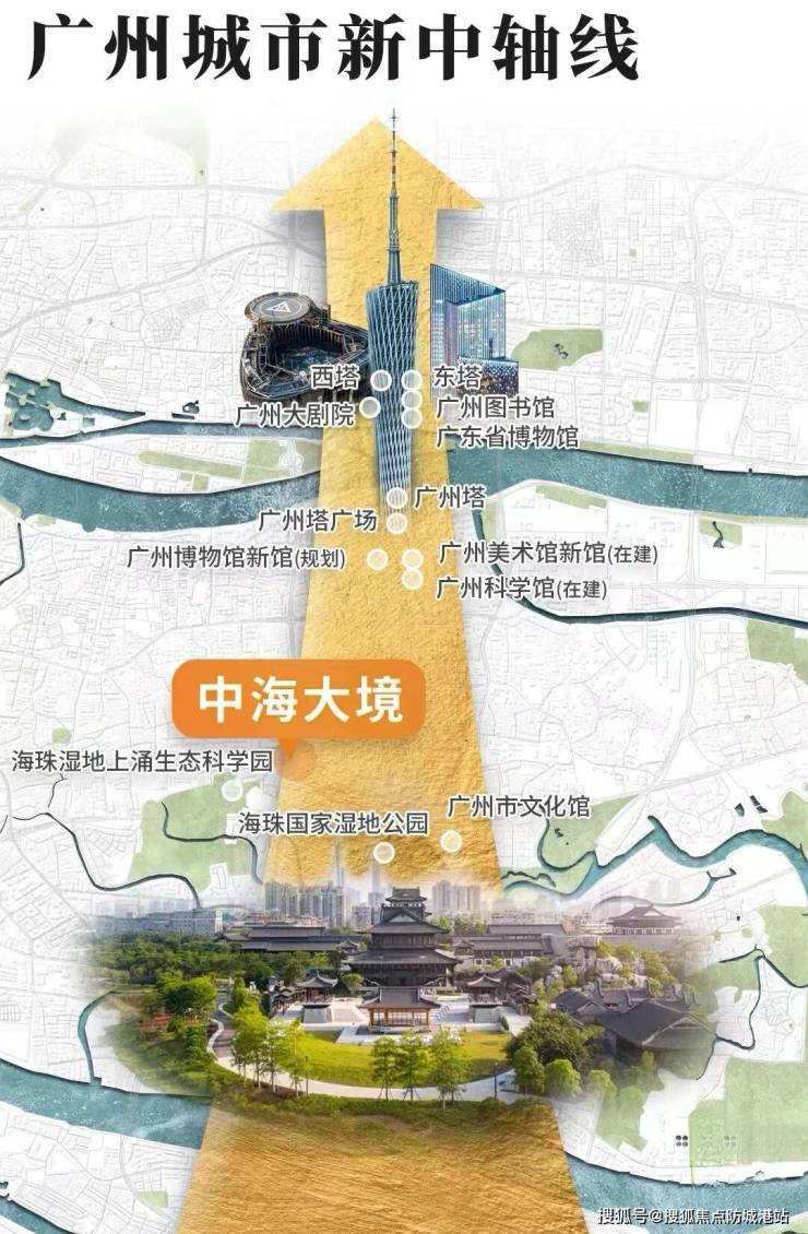 中海大境位于广州城市新中轴线的南段,地理位置优越。广州城市新中轴线先后诞生了天河北、珠城两代CBD,而中海大境所在的区域,往南延伸有“一塔一场四馆”等地标配套,商业、文化、艺术IP地标云集,规格完全不输珠江新城。
