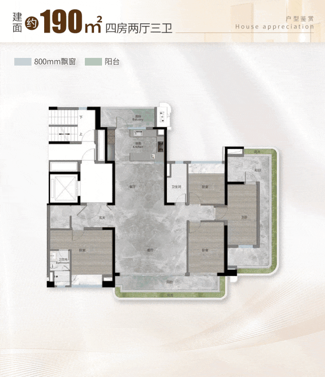 约190㎡四房:南向景观阳台横跨客餐厅,尺度很大;主卧套房,衣帽间够大,卫生间也能放得下浴缸。