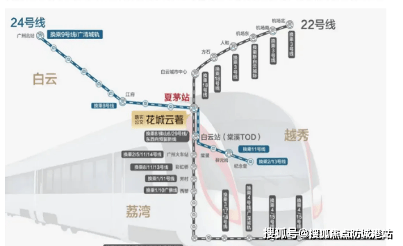 项目堪称白云刚需盘的交通标杆,距在建的地铁22号线、8号线北延段夏茅站仅20米,步行3分钟即可进站,未来还将接驳规划中的24号线,形成三轨交汇格局。乘坐22号线1站直达白云新城,2站抵达越秀,3站进入荔湾,换乘18号线后5站就能直达珠江新城(冼村),通勤效率大幅提升。8号线北延段则串联越秀、花都,快速抵达广州北站和白云棠溪TOD,轻松实现跨区出行。
