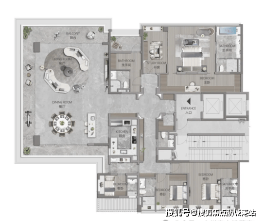 二期345㎡六房两厅六卫:一梯一户设计,预留收纳空间,勾勒生活秩序美学;约270°环线超长阳台,打造IMAX江幕视野,推窗即揽珠江盛景;5套间卧室设计,实现阳光与景观的平权,每一位家人都能享受舒适居住体验;客、餐、厨、阳LDKG一体布局,构建全家人的共享生活场域;主卧奢配独立步入式衣帽间、淋浴区,尊享高配私域生活。