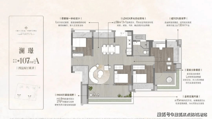 107㎡户型:提供四房双主套设计,适合大家庭居住。
