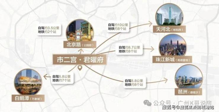从城市发展轨迹来看,广州的繁华始终与珠江相伴,从曾经的十三行、白鹅潭,到如今的珠江新城、琶洲、金融城,均沿珠江岸崛起,而君曜府所在板块,正是这一发展脉络中的重要枢纽。项目屹立于珠江南岸,一桥贯通珠江南北,不仅无缝衔接两岸核心资源,更承担着中轴连接海珠江南大道商圈群的重要功能,汇聚经济、文化、交通等多重核心优势,区位价值凸显。
