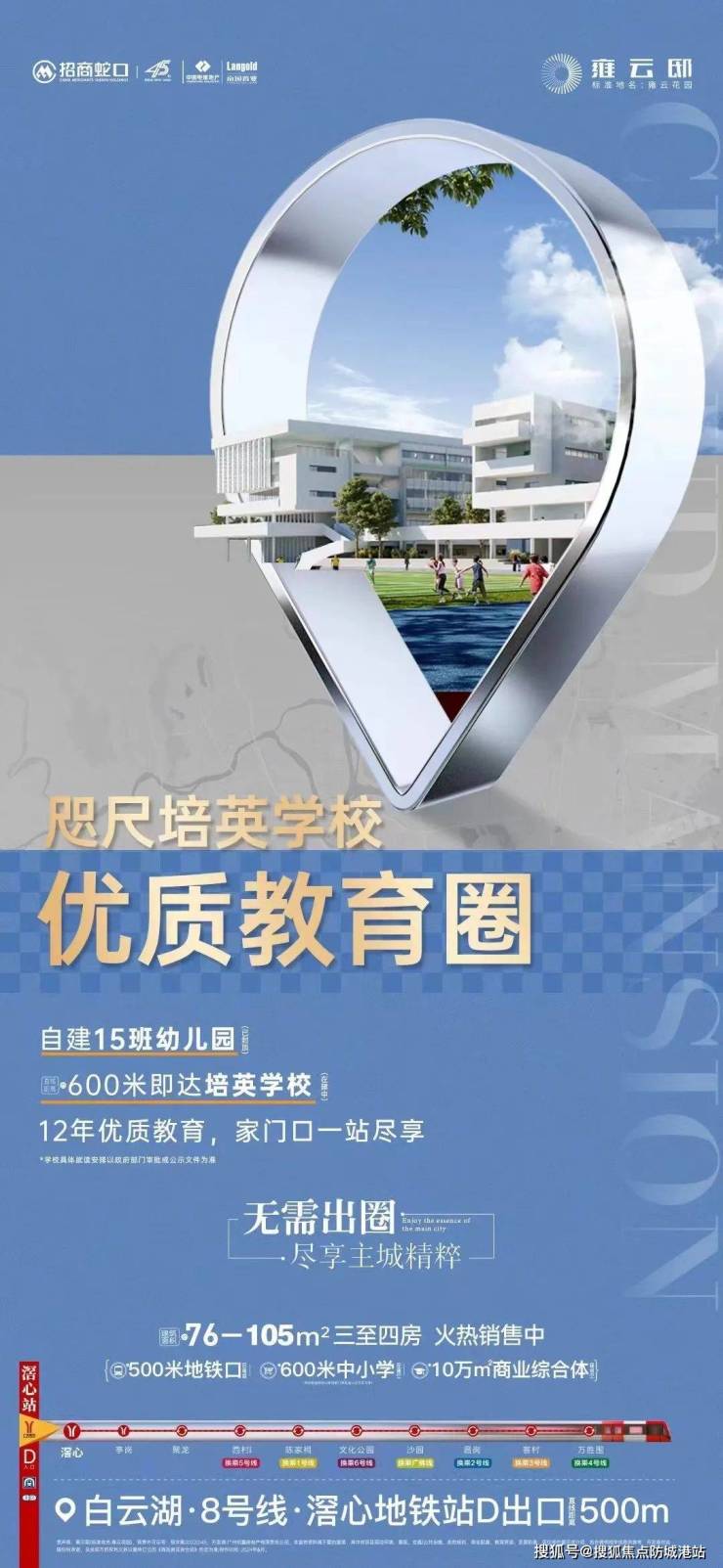 4、教育资源对于众多家庭来说至关重要,而招商·雍云邸在这方面优势突出。广州培英教育集团官宣在白云湖黄金围落地1所九年一贯制学校,这一消息无疑是片区教育资源的重大升级,让周边业主兴奋不已。该学校距招商·雍云邸仅约300米,项目将充分享受这一重磅红利。培英教育集团在白云教育界占据龙头地位,在白云已有12个校区,此次落地的白云湖校区是其第13个“分舵”,规划配置54班“中学 + 小学”,教学质量一脉相承。培英核心校——培英中学,拥有100多年的建校史,是妥妥的百年名牌老校,高考升学率常年霸榜白云,2018 - 2021年本科上线率高达90.3%,连续4年稳居白云TOP1。初中部表现同样优秀,今年平沙培英学校以全区最高分的成绩,夺得区属公办学校中考TOP1。培英中学在今年中考招生分数线上,以670高分在白云位列前茅,仅次于白云铁一,深受家长圈认可。集团化办学的优势在于师资力量与教学资源的共享,实现教学经验的“互通有无”,白云湖校区有望引入集团优质教学管理体系,令人期待。同时,该学校的落地将增加白云湖学位供应,明确为九年一贯制学校,在当前学位紧张的情况下,能更好地满足片区入学需求,且周边业主子女学位“跳票”概率更小。目前新校已启动建设,预计2024年建成投用。