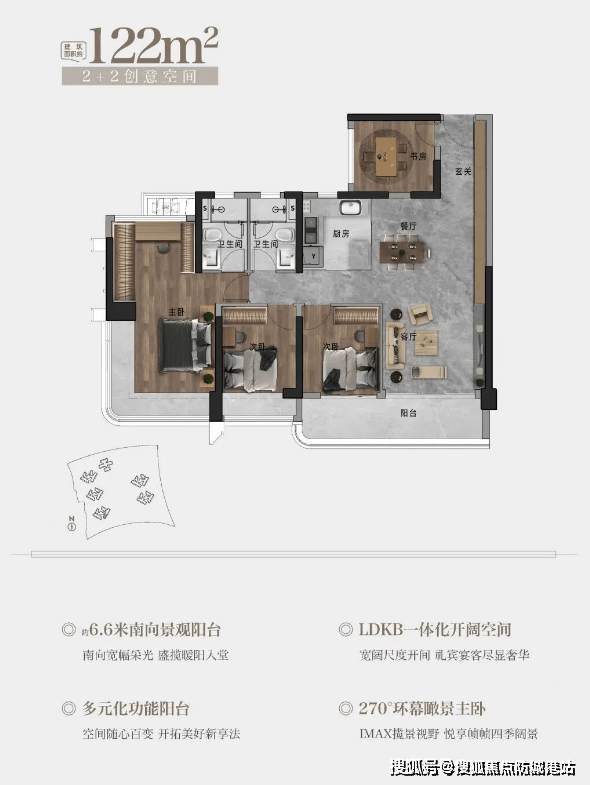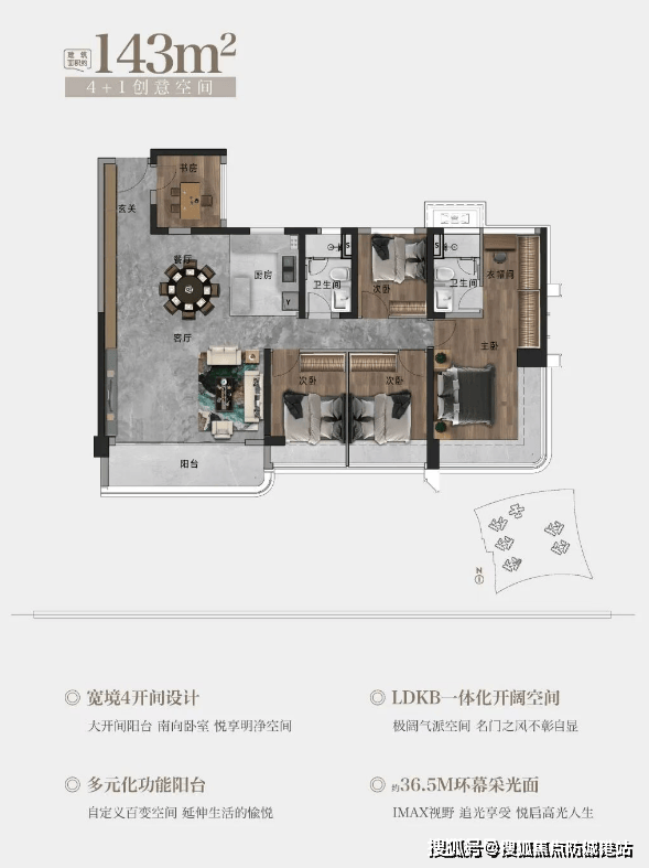 143㎡五房:6.6米南向景观阳台,多元化功能分区(花园、健身区、茶室),满足家庭多样化需求。