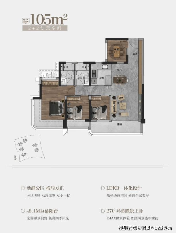 105㎡四房:得房率89%(含赠送面积),同比区域均值高8%。四开间朝南,采光面达12.8米,主卧270°转角飘窗,视野无遮挡。LDKB一体化设计(客厅、餐厅、厨房、阳台连通),增强家庭互动性。