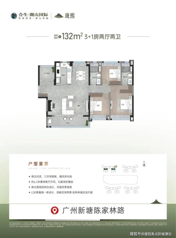 132方 3+1房户型:实用率超八成,三开间朝南,南北景观双阳台设计。