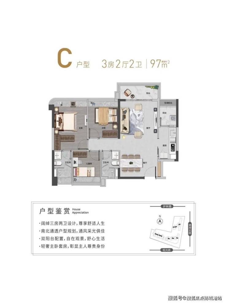L型建筑布局,超宽楼距,南北朝向,采光充沛。
