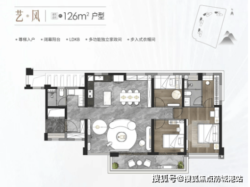 126㎡三房:尊梯入户设计,拥有阔幕阳台、LDKB一体化空间、多功能独立家政间和步入式衣帽间。