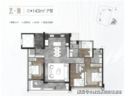 143㎡四房:L型阳台增加了空间的灵动性,LDKB设计让公共空间更加开阔,酒店式套卧提升了居住舒适度。