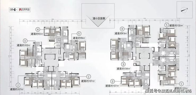 项目体量不大,总共有3栋高层住宅(其中3栋为村民安置房、1栋为政府安置房),仅剩2栋商品房。在售面积段为93-132㎡三至四房,梯户比为3梯5户。采用“新中式合院”设计,通过30度楼体扭转实现更宽敞的楼间距和更开阔的景观视野。