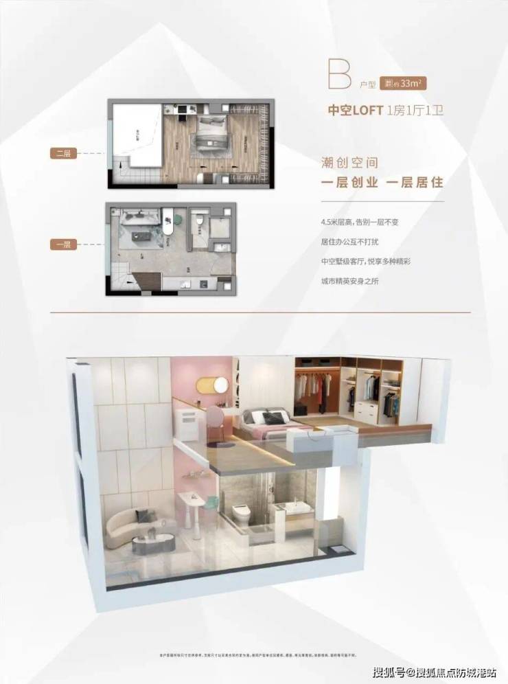 :LOFT一房一厅,4.5米层高,可实现一层办公一层居住,适合创业人士或年轻白领。