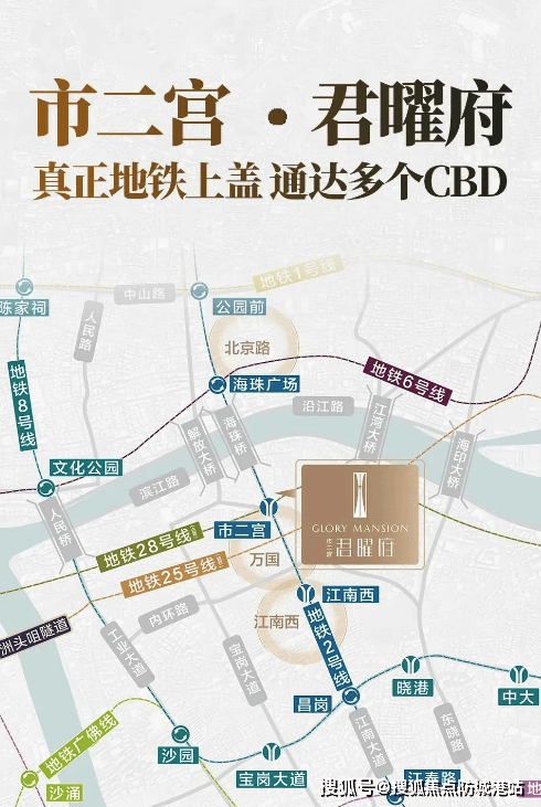 首先是地铁配套,这是君曜府最核心的交通优势,也是买房人最关心的一点。项目位于地铁2号线与28号线(佛穗莞城际,在建中)的交汇点市二宫站上盖,其中地铁2号线已通车,是广州的核心地铁线路之一,可畅连北京路、万国、江南西等多个核心商圈,快速通达珠江新城、琶洲等CBD,出行效率极高。