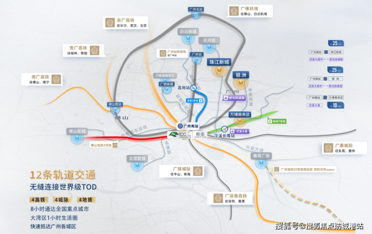 地处广州南站世界级TOD核心区,坐拥12轨交汇(4高铁+4城际+4地铁),30分钟直达珠江新城,1小时串联大湾区,8小时辐射全国。广深港高铁直连香港西九龙,实现港穗无缝互联,契合港人置业需求。