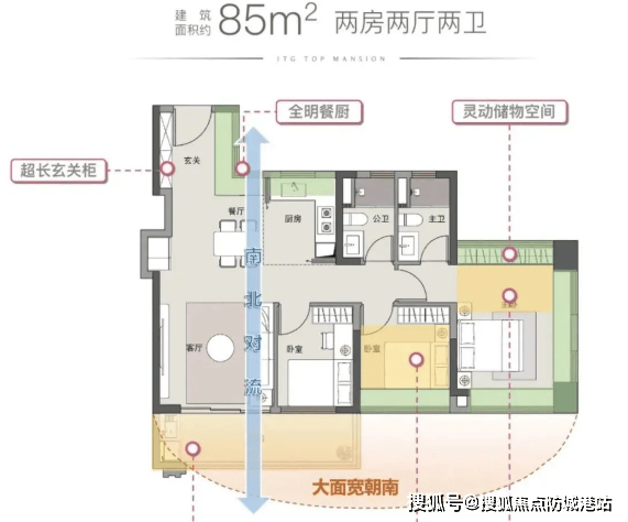 答:85㎡户型实际使用面积约 87.55㎡,采用全南向设计,客厅连接景观阳台,保证采光与视野;卧室均带飘窗,拓展实用空间,且布局紧凑无浪费,主卧带独立卫浴,满足三口之家日常需求,是刚需家庭的优选。