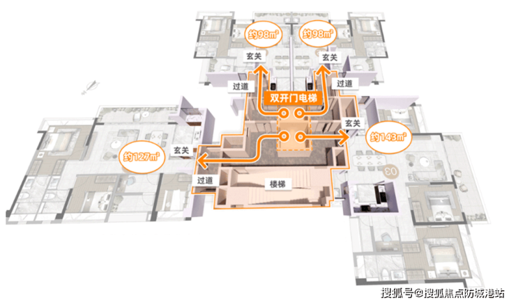 建面约143㎡4房2厅2卫,豪华主卧套房,超大 270°转角飘窗,大面宽采光面+超大方厅,约14.6m超大南向采光面,双面景观阳台+满飘窗,约7.3m 超大阳台。