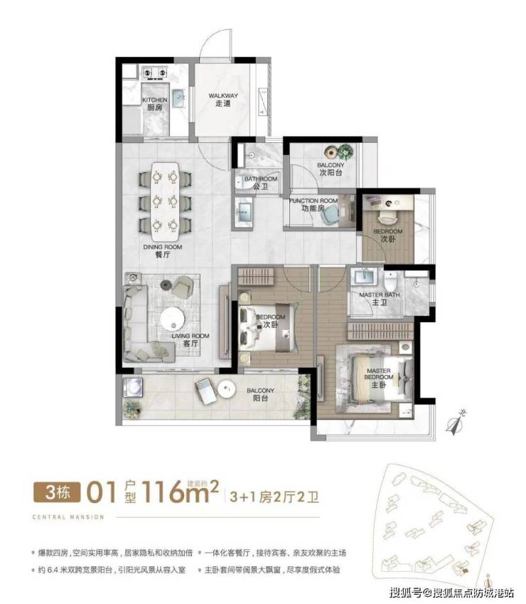 建面约116㎡4房2厅2卫(横厅),豪华主卧套房,超大270°转角飘窗,三开间南向采光,约10.4m超长南向采光。