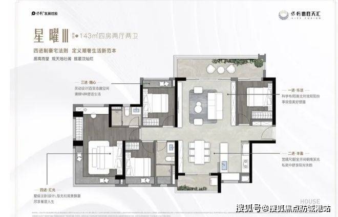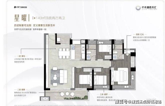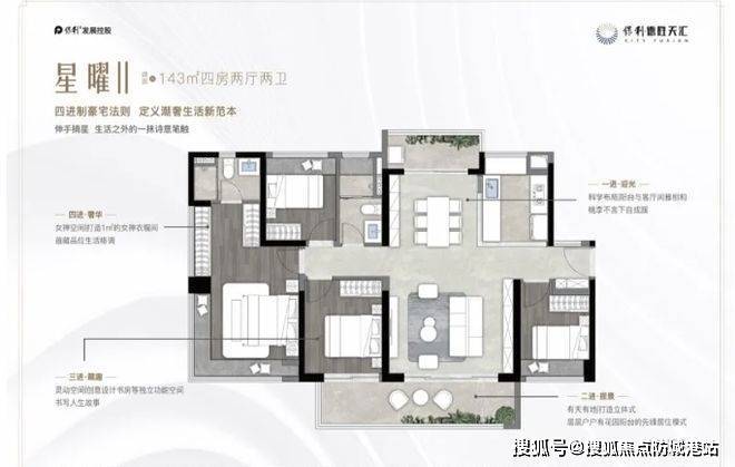 在空间尺度上更加阔绰,客厅、餐厅与阳台一体化设计,形成宽敞通透的公共空间,营造出大气的居住氛围。四房格局,满足三代同堂或二孩家庭的居住需求。主卧空间开阔,配备大尺寸飘窗,可欣赏窗外美景,独立衣帽间与卫生间,彰显主人尊贵身份。次卧同样注重空间感与舒适性,每个房间都能保证良好的采光和通风。此外,该户型的阳台拥有更大的进深和长度,为业主提供更多的休闲可能性,如打造空中花园等。