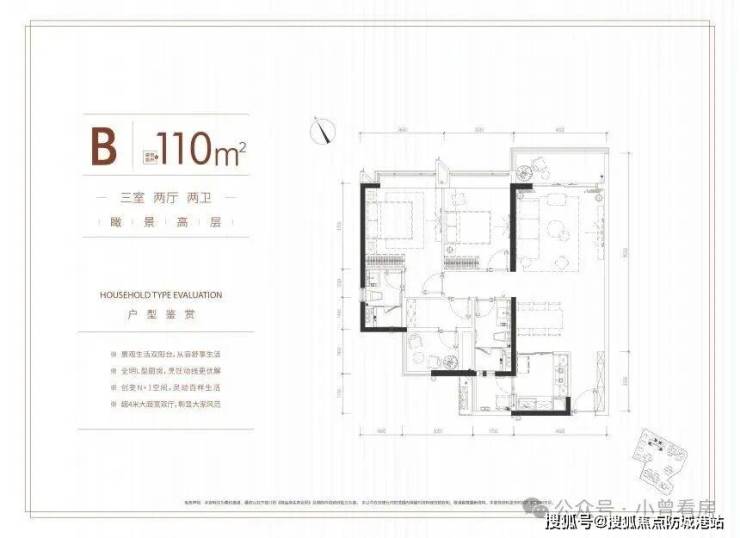 约110平方米三房两厅两卫: 此面积段提供B、C两种户型选择。B户型通常采用经典竖厅设计,采光面充足,主要房间朝向佳,居住舒适度高。C户型则可能在厨房空间设计上更具优势,提供了更宽敞的操作台面,满足热爱烹饪的家庭需求。两种户型均做到双卫配置,提升了家庭生活的私密性与便利性。