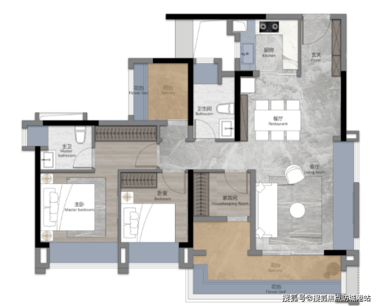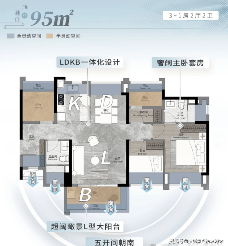 95㎡四房两厅两卫:五开间朝南,超阔瞰景阳台,南北对流设计,奢阔私密主卧套房,升阶生活仪式感。