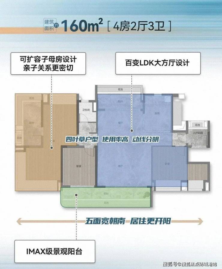 项目共规划4栋住宅楼,均为37层,分高低区设计,而且梯户比跟户型都各不相同: