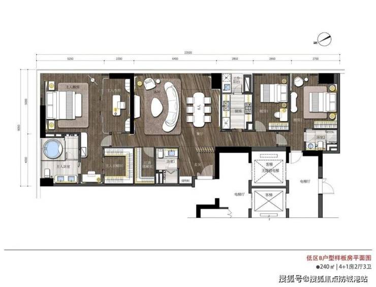 240㎡4+1房2厅3卫:逾7米阔景会客厅揽云山大境,主次分区纯粹,双向入户动线尊荣私密,3.4米挑高明亮,三梯三户商务精英首选;