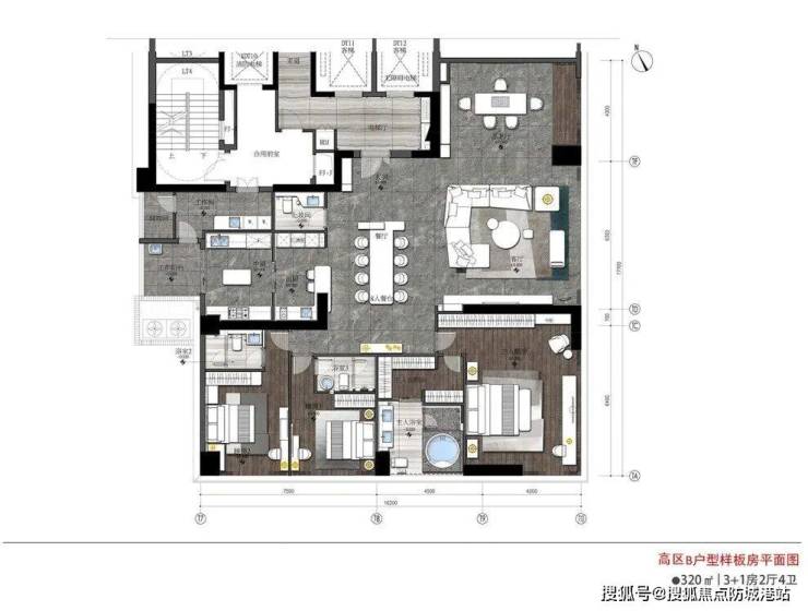320㎡3+1房2厅4卫:南向瞰景三梯两户,双入户+N+1设计,三代同堂或收藏会所两宜。