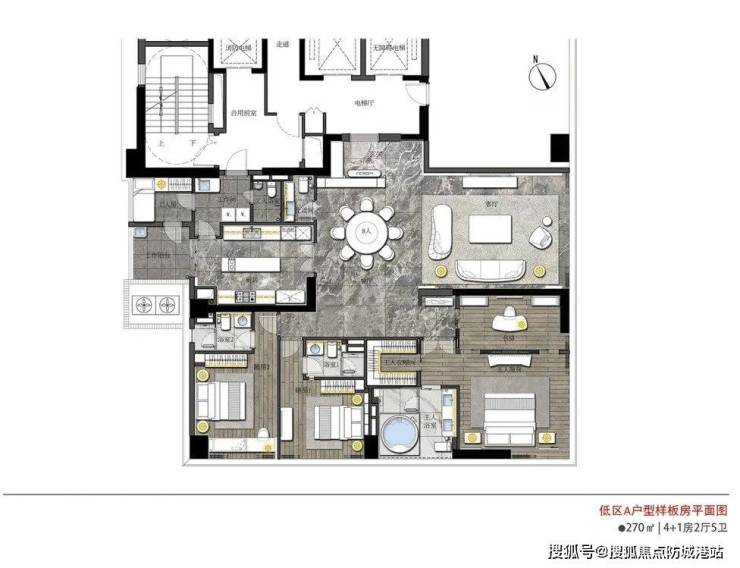 270㎡4+1房2厅5卫:精奢观景客厅尽揽胜景,双电梯入户私密会晤,270°环幕落地窗,功能区秩序整然,N+1柔性空间解锁多代/会客需求;