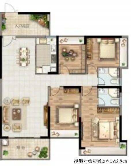 115㎡的三居室户型,空间尺度更为舒适,能满足家庭对居住空间的进一步需求。入户后,宽敞的玄关可打造为多功能收纳区,满足家庭多样化的收纳需求。客厅与餐厅相连,形成开阔的公共活动区域,客厅采用方正设计,搭配大尺寸景观阳台,采光通风极佳,可将社区美景尽收眼底,同时为家庭聚会、休闲娱乐提供了充足空间。