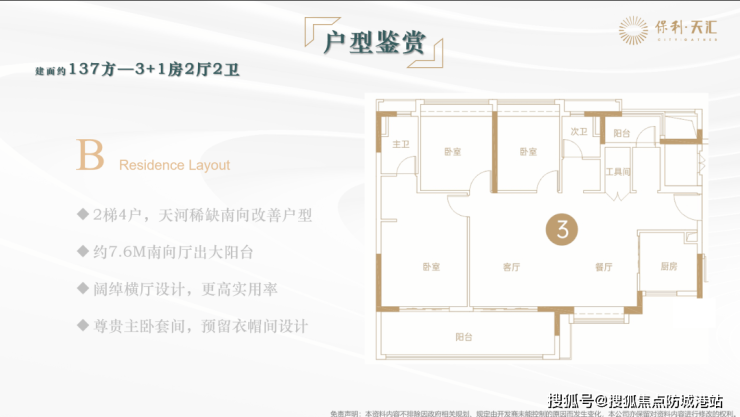 保利天汇位于广州市天河区大观中路120号,坐落在天河智谷板块,占地30万㎡,总建筑面积78万㎡,容积率4.59,绿化率23%。项目规划16栋住宅,分五期开发,涵盖高端住宅、商业、写字楼、酒店公寓等多业态产品。当前在售五期,主推99-131㎡三至四房精装户型,总户数约1790户,车位比1:1.33,为改善型买家提供丰富选择。