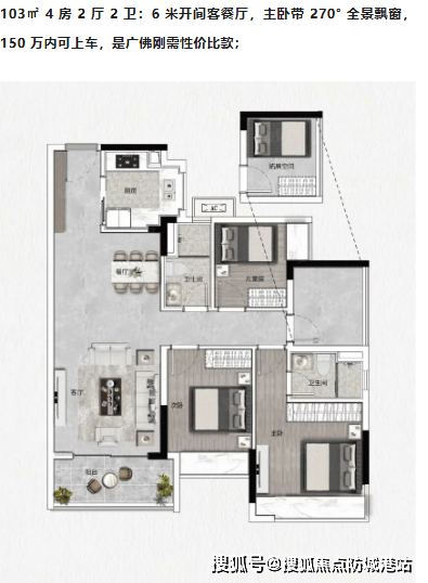 再看那103平方米的四房两厅两卫户型,则是为那些追求更大空间的改善型家庭量身打造的。6米开间的客餐厅设计,瞬间拉大了视觉纵深感,让家人之间的互动更加自然流畅。主卧特别设计了270度的全景飘窗,这不仅是一个观景的平台,更是一个私密的休闲角落。当夜幕降临,坐在飘窗前,看着窗外的万家灯火,内心会涌起一股难以言喻的宁静与满足。150万以内的总价门槛,对于许多有孩子的家庭来说,是一个极具吸引力的选择。它不仅提供了足够的房间数量以满足多代同堂的需求,更通过精心的设计,让每一寸空间都物尽其用。这种高性价比的产品,正是当下市场中最受追捧的类型之一。
