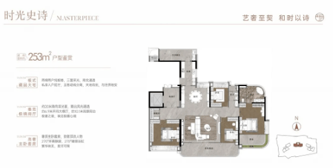 253㎡四房两厅两卫:南北对流,阳台长达10米,主卧和主卫均为270度弧形采光面,视野一流。