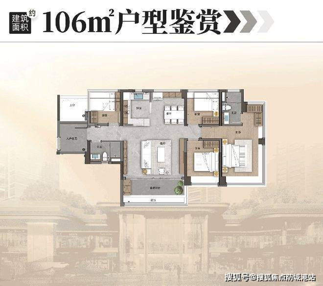 建面约106平方米户型:五开间朝南,南北对流,格局和空间感堪比140平方米以上的豪宅,适合三代同堂的家庭。
