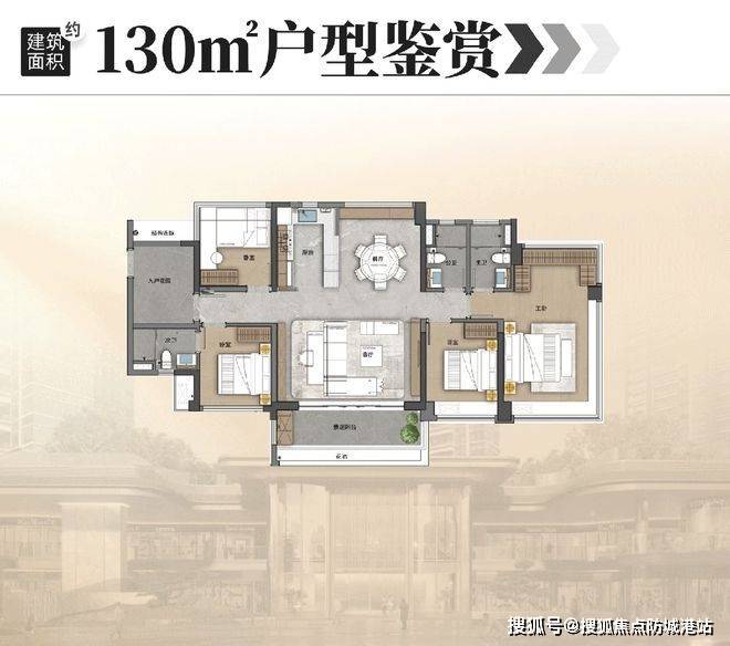 建面约130平方米户型:采用双主套设计,将以往需要160平方米才能实现的功能用更少的面积做到,同时配备了LDKB方厅、主卧环幕采光、独立衣帽间等高端设计亮点。