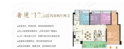 125㎡四房两厅两卫:改善型户型,带装修总价约350万起。