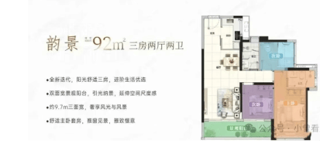 92㎡三房两厅两卫:带装修交付,单价2.6万至3.05万元/㎡。