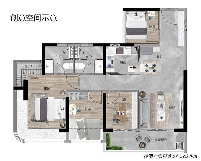 2梯3户设计,南向直面山景,主卧270°转角U型景观面,空间通透。
