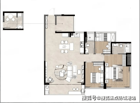 选取项目两大主力核心户型展开深度解析,首先是建面约105㎡经典改善三房户型,整体格局方正规整,全明无暗间设计,全屋通风对流效果优异。户型采用全南向设计,客厅开间约4.2米,连接约6.8米超大景观阳台,采光通风俱佳。U型厨房设计,洗切炒动线合理,紧邻餐厅,方便备餐。主卧配备独立卫浴、全景飘窗、步入式收纳空间,套房设计保障居住私密性与舒适度,小户型也能实现高阶居住体验,适配三口之家、二胎家庭刚需改善。